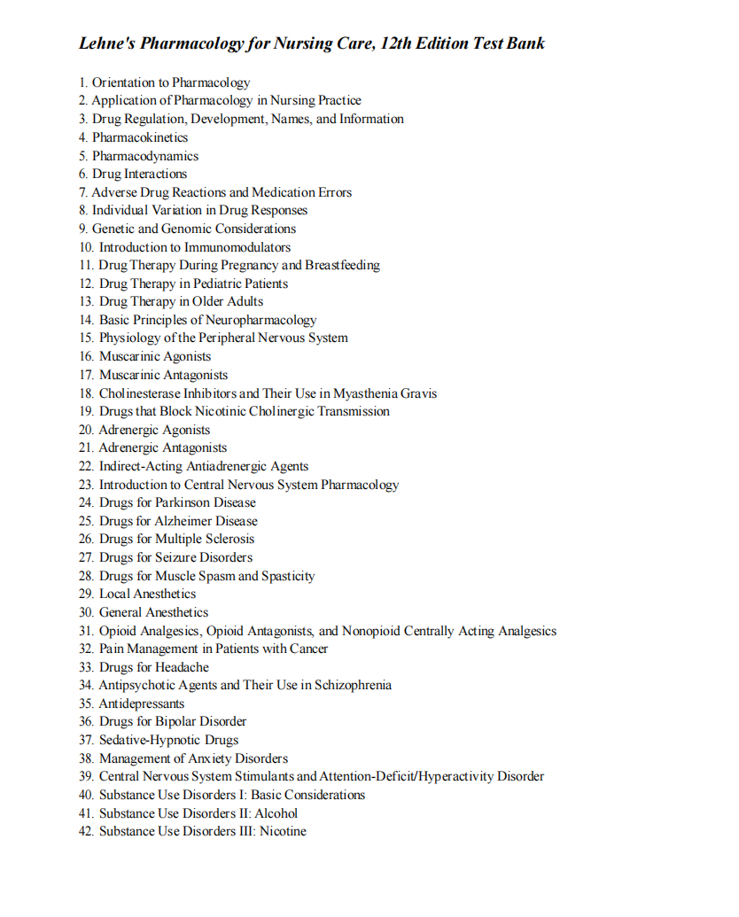 This test bank is created to accompany the 12th edition of Lehne’s Pharmacology for Nursing Care. It offers a detailed set of practice questions designed to help nursing students master core pharmacologic principles and prepare for exams.