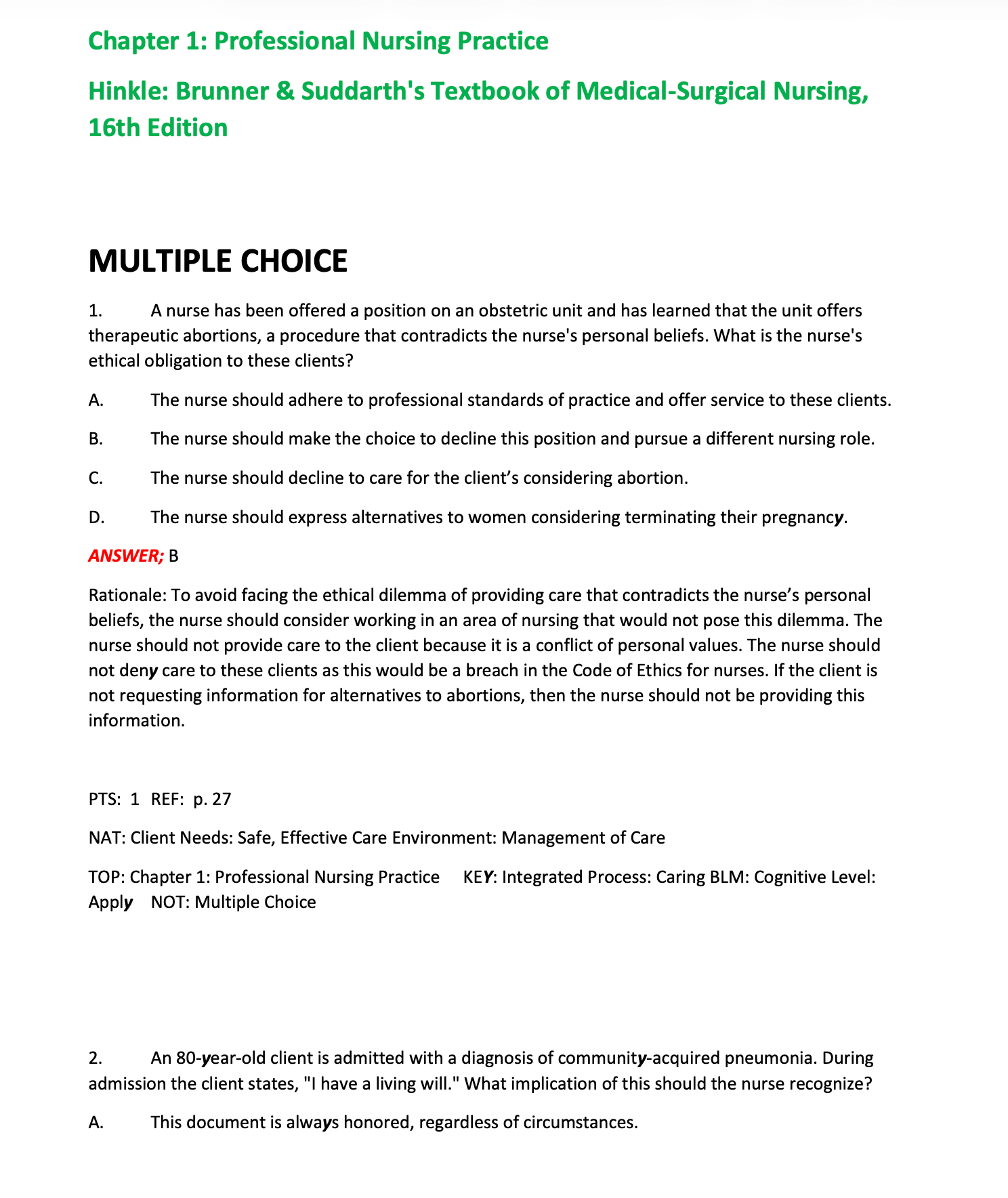 This test bank is designed to accompany the 16th edition of Brunner & Suddarth’s Textbook of Medical-Surgical Nursing by Hinkle. It provides a comprehensive set of practice questions to help nursing students apply theoretical knowledge to real-world adult patient care scenarios.